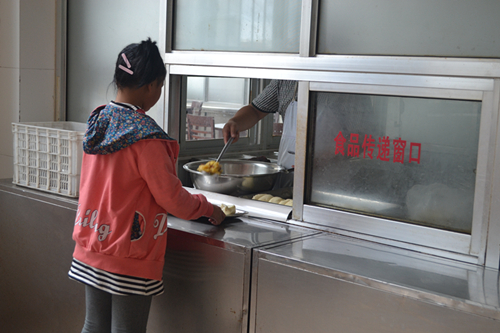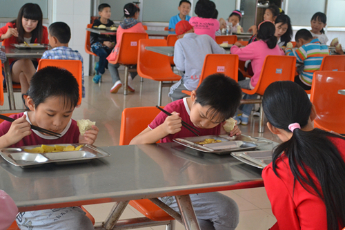 餐厅。中午12:00左右,在值班老师查对好人数后,儿童们会自觉的去窗口打饭菜,然后到固定座位吃饭。