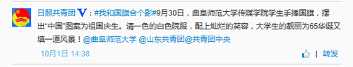 学生手持国旗,拼成“中国”图案,为祖国庆生。选择这样的方式拍照,他们实属第一个,合影随即被日照共青团转发。澳门巴黎人娱乐城