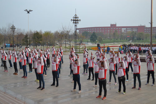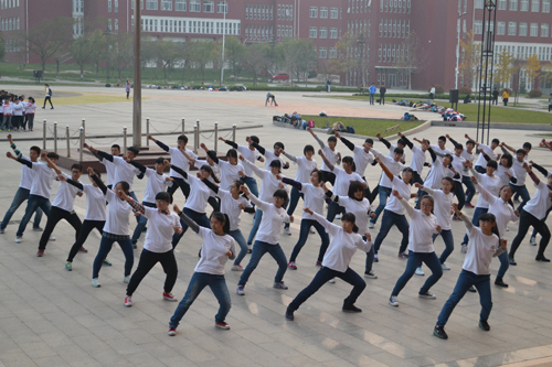 的学生身着院服和文化衫齐聚日月广场。除了练习基本的广播操动作之外,各班对于入场方式也都动了“小心思”,力求拿出看家本领,入场创意别具一格。