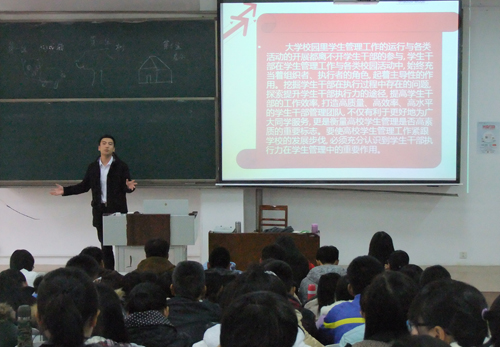 随后,王磊以诙谐幽默的语言向大家阐述了学生干部执行力的内涵,他指出执行力主要体现在学生干部在执行活动前的计划能力、领会程度、预测水平,活动中的组织能力、创新意识,活动后的总结、评价等方面,并说明执行力是学生干部高效优质完成各项工作与任务的前提,这不仅能提升学生管理,也打造个人核心竞争力。对此他向大家说明了学生干部应遵循的标准,需要有认真完成任务的态度;在规定时间内完成任务;杜绝拖沓,以及任务保质保量、不打折扣。