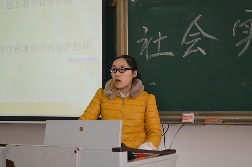 义工与社会实践部部长马妍琪上台与大家分享了参与社会实践的心得。她以本次暑假社会实践为例,首先介绍了什么是社会实践,她指出,社会实践通俗的讲就是社团活动,与同学组队利用假期时间做一些活动来增长知识,开阔视野,当代大学生应该积极参与这样的活动。随后,她向大家介绍了社会实践的准备工作与实施步骤。她强调在进行社会实践的时候一定要对选题有周全的计划,也要有灵活的头脑来应对突发状况。然后,马妍琪就如何写好社会实践报告与大家做了具体交流,对题目、摘要、关键词等细节问题结合具体事例做了解释。最后,她对本次活动做了简短的总结并鼓励大家多多参与实践活动,也对参与本次宣讲活动的人员表示了感谢与元旦祝福。