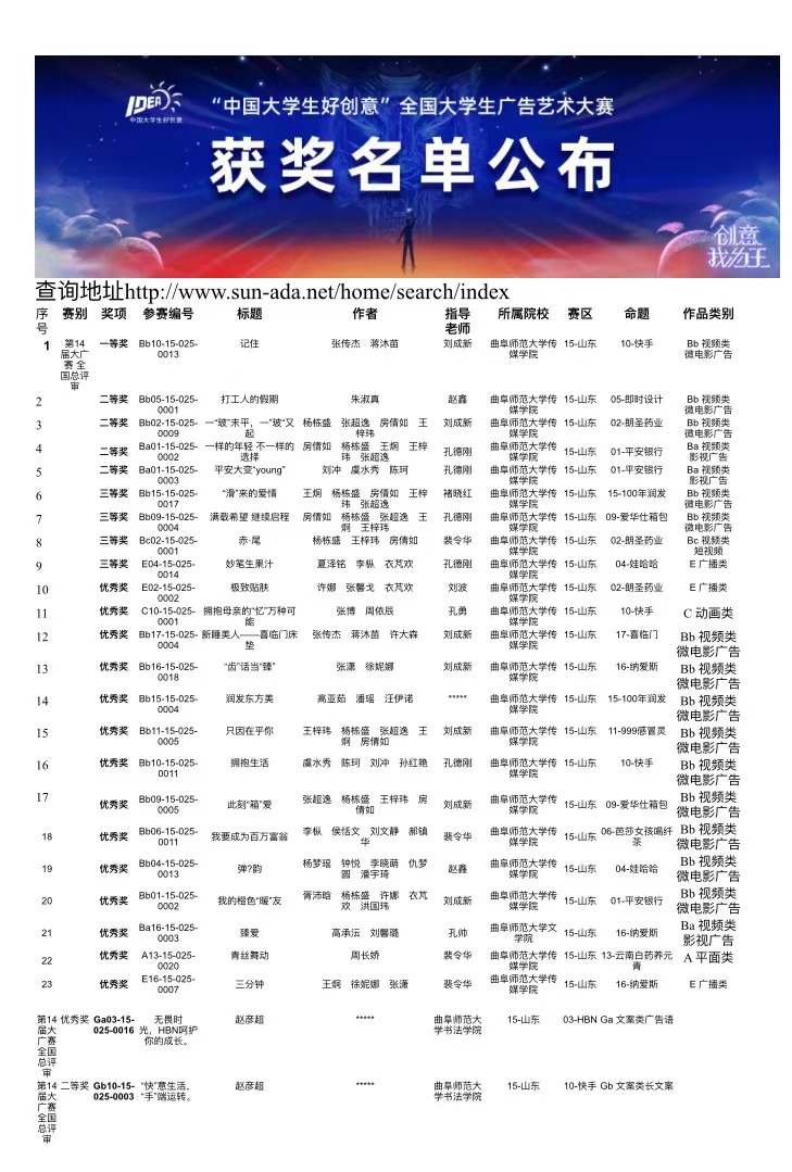 近日,第十四届“中国大学生好创意”全国大学生广告艺术大赛获奖名单公布。传媒学子在本次大赛中大展身手,获得全国一等奖1项、二等奖4项、三等奖4项、优秀奖14项,获得等级与数量再创历史新高; 澳门巴黎人娱乐城