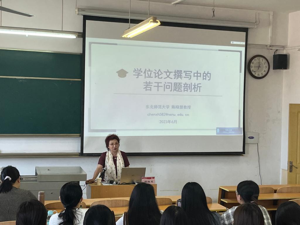 陈晓慧从学位论文的题目表述、摘要、文献综述、概念界定、研究意义、研究方法与思路、理论基础、研究设计、学位论文写作规范性等十一个部分展开讲解,通过具体事例生动形象地讲解了学位论文写作中遇到的问题及解决办法。与会学生围绕学术论文写作时遇到的困惑积极向陈晓慧教授展开提问,进行了深入的交流。最后,于颖就陈晓慧的报告内容进行总结。