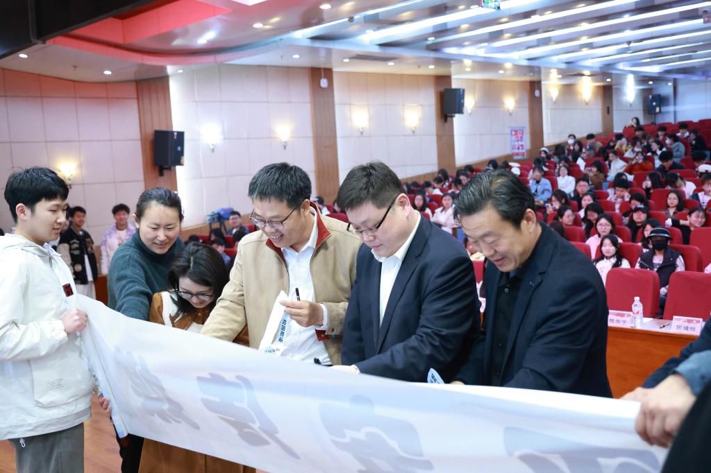 领导老师登台撕下“平安传媒”卷轴上的安全风险事件,共同助力和谐校园建设,并在卷轴空白处签名正式拉开本届澳门巴黎人娱乐城