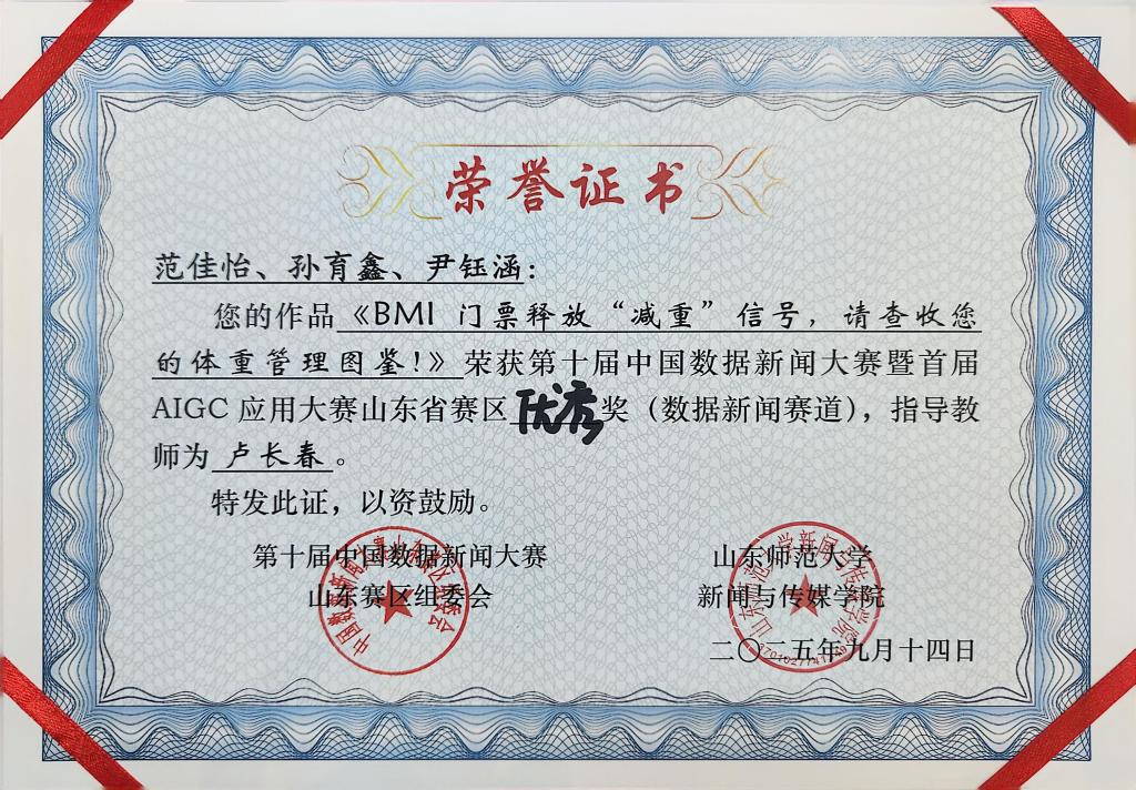 教师卢长春指导,2022级传媒学子李咏姿团队的作品《数智化无障碍城市,让视障人群走得更远》荣获省级二等奖,2023级传媒学子王佳团队的作品《体重警报:中国肥胖率飙升背后的饮食革命与生活重构》荣获省级三等奖,2023级传媒学子范佳怡团队的作品《BMI门票释放“减重”信号,请查收您的体重管理图鉴!》荣获省级优秀奖。指导教师卢长春被评选为“优秀指导教师”。