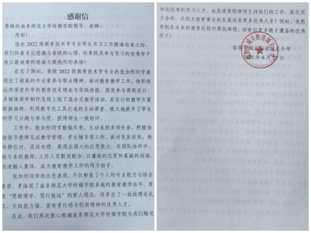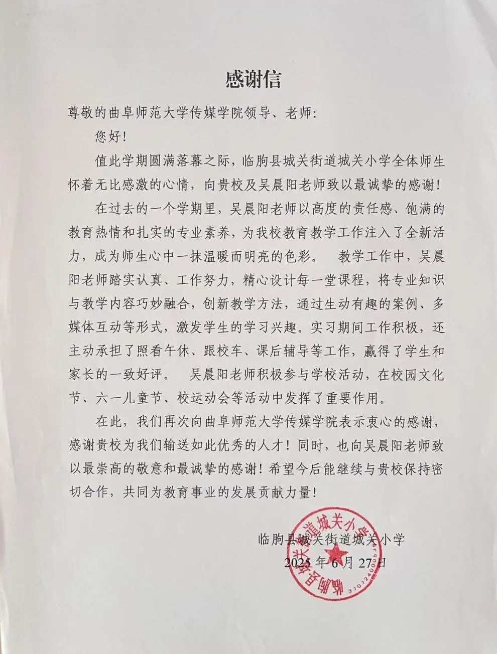 收到来自临朐县城关街道城关小学的两封感谢信,信中对澳门巴黎人娱乐城
