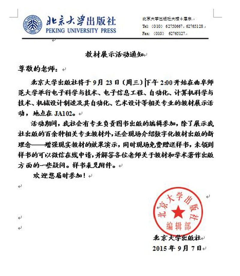 北京大学出版社将于9月23日(周三)下午举行展书、送书活动,先到先取,请老师们积极参加。