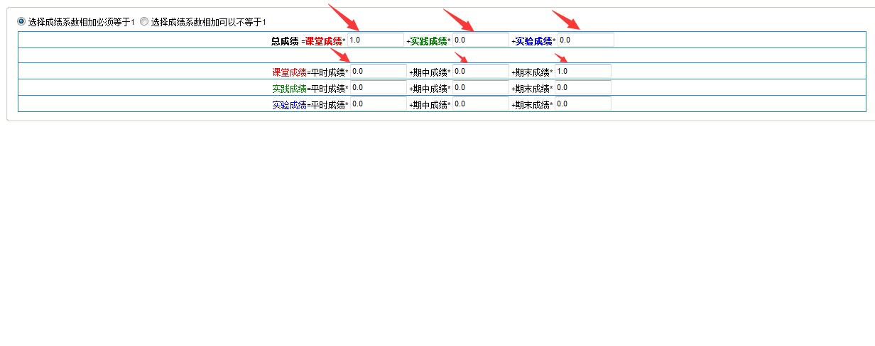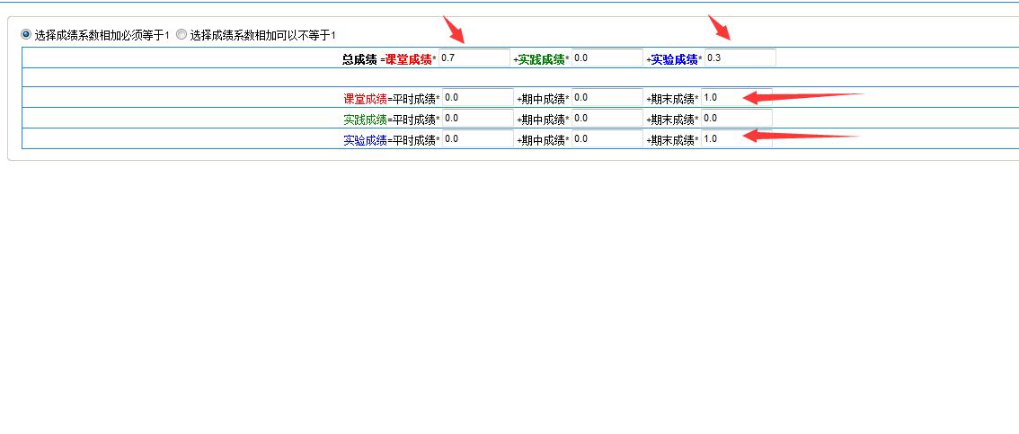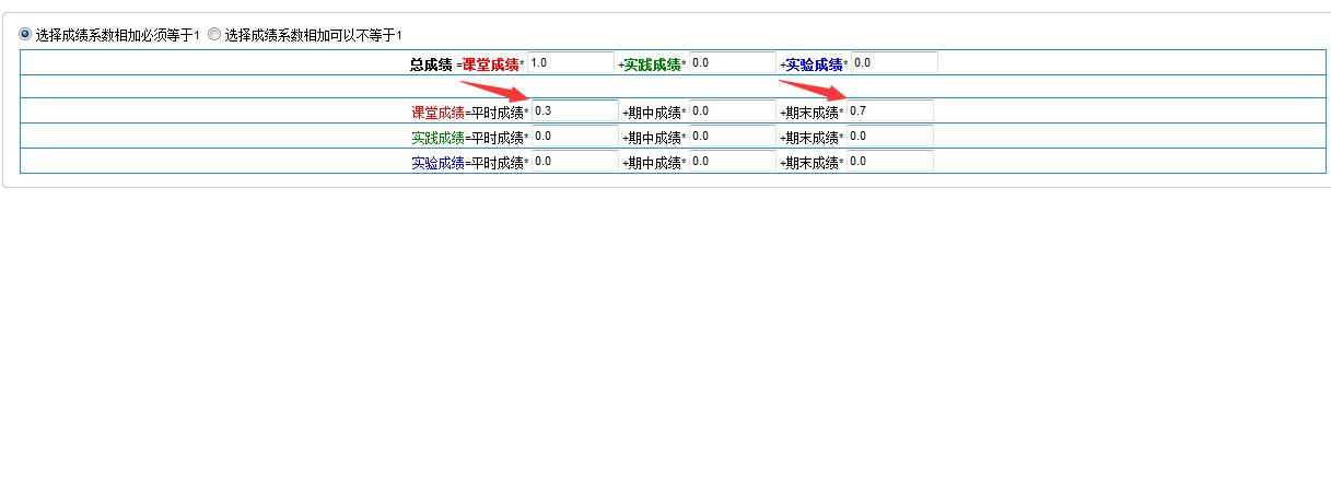 保存系数设置,进入成绩录入页面,会显示录入两个成绩,这两个成绩都是原始成绩(不能填百分比之后的成绩),如图: