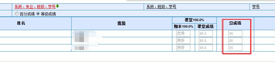如果没有选择“等级成绩”录入,则默认为“百分成绩”,在此种情况下,即使录入了“优秀”“良好”等等级成绩,系统还是默认记录分数成绩,如下图: