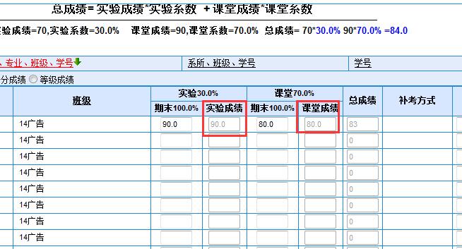 实验成绩90分,录入90;课堂成绩80分,录入80.总成绩在“暂存”之后,系统会自动计算。
