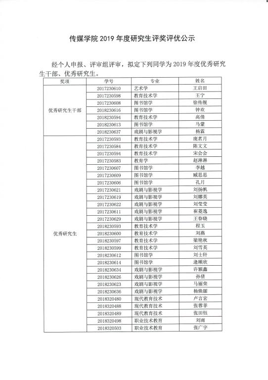 澳门巴黎人娱乐城 2019年度研究生评奖评优公示